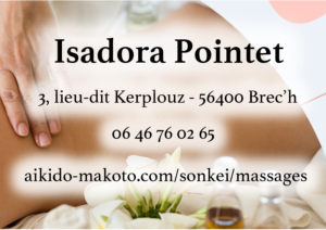 En accueil dans un cadre ressourçant à mon domicile au 3, lieu-dit Kerplouz à Brec’h (longère au fond de l’impasse, à côté du Sonkei Dojo). Je vous reçois sur rendez-vous en me contactant au 06 46 76 02 65 ou par mail à cette adresse : pointet.isadora@orange.fr