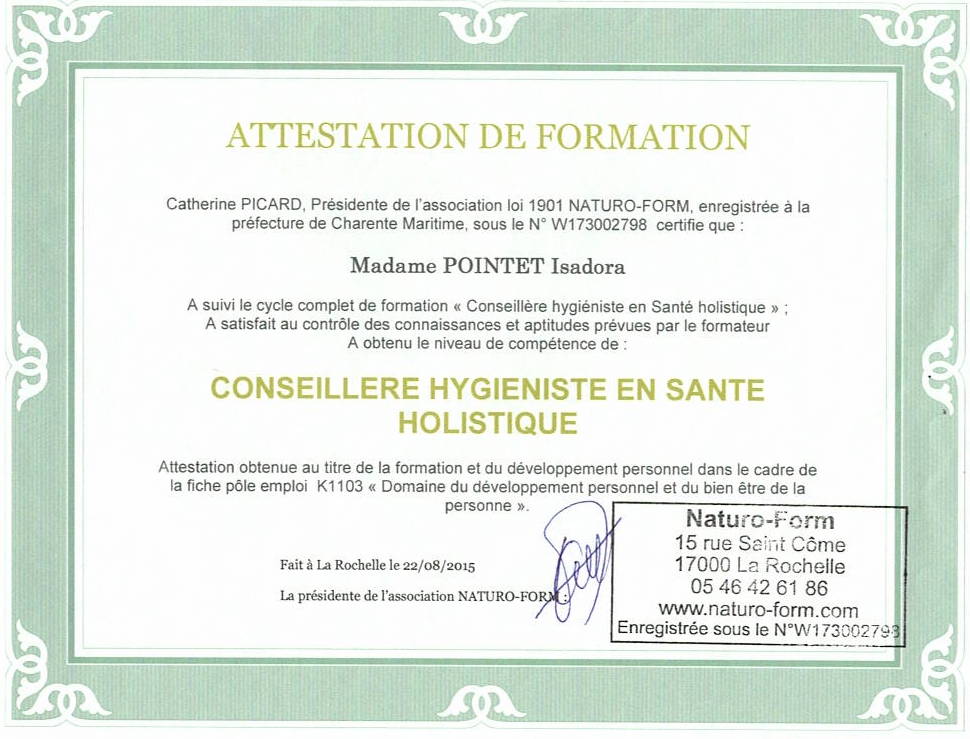 La formation que j’ai suivie en Bretagne et à La Rochelle, auprès de Catherine Picard, Naturo-Form, infirmière DE et naturopathe à La Rochelle, totalise 1500 heures (évidemment à 100% en présentiel et jamais en ligne) réparties sur trois ans. Ceci en plus de divers stages extérieurs dans les domaines du bien-être, notamment auprès de Michel Martinat, kinésiologue comportementaliste.